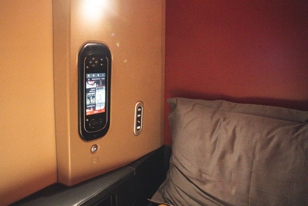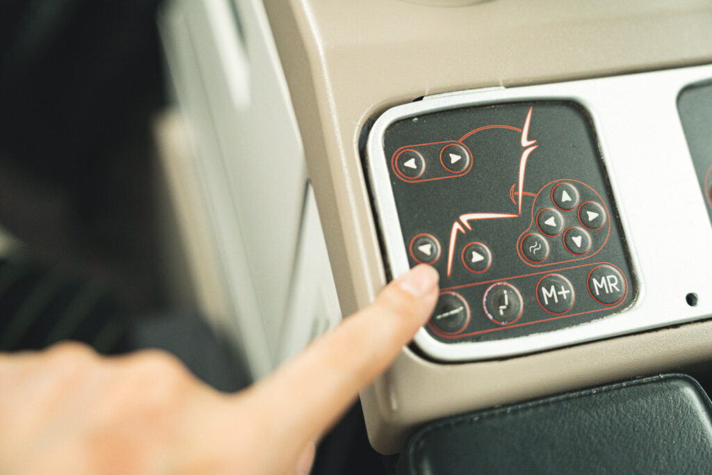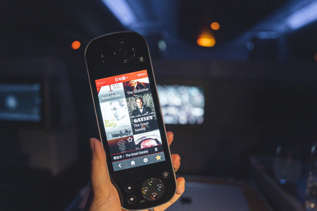 そのシートピッチの広さゆえ、画面にタッチできないほどモニターが遠くにありますが、手元のリモコンで全て操作可能。