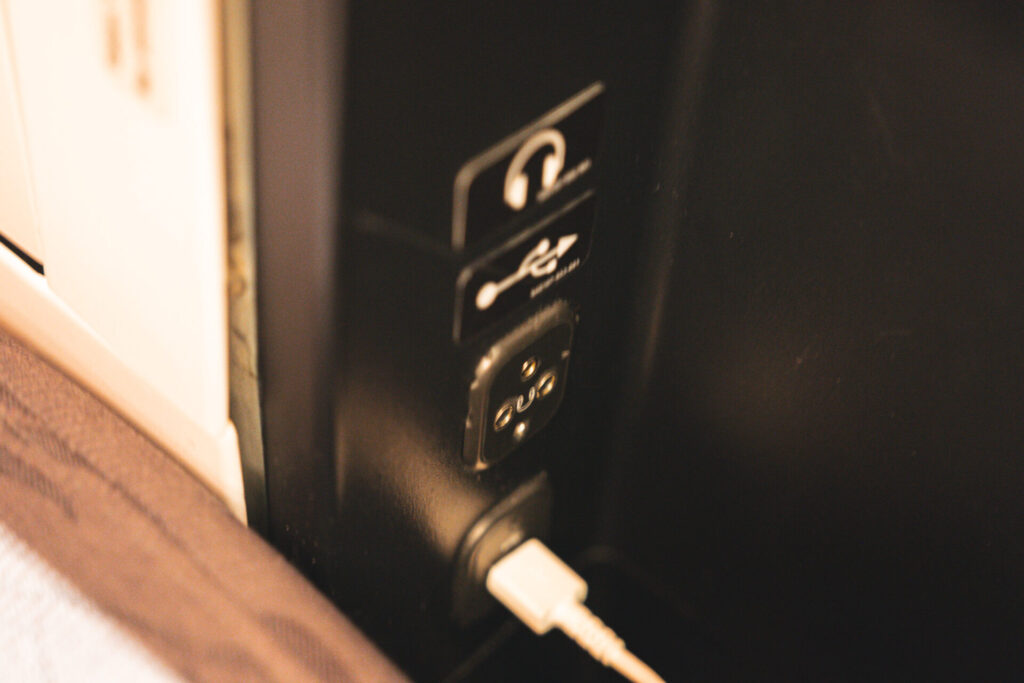 手元のすぐ横には収納スペースがあり、USBやコンセントでの電源がついているので、スマホなどはここへin。