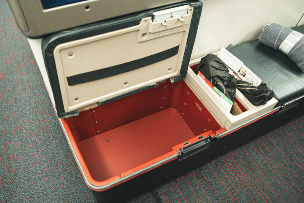 よくあるビジネスクラスだと、身のまわりに物を置ける収納スペースが小さく、大型の荷物は頭上に入れなければいけなかったりしますが、このシートは足元にバッグごと入れられる程の大きな収納スペースがあります。