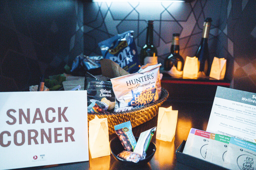 そしてギャレーの脇には、食後しばらくすると自由にいただけるスナックとドリンクのコーナーが登場するのでぜひチェックしてみてください。