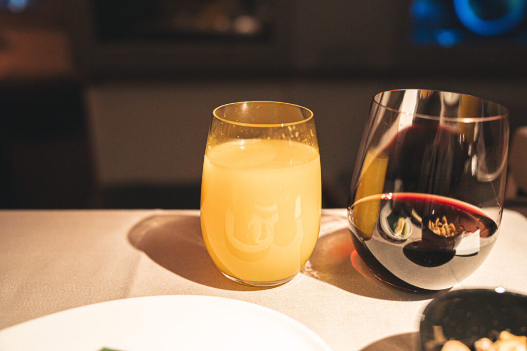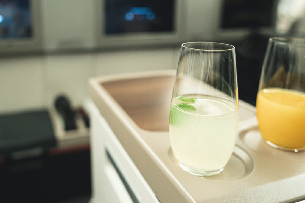 ウェルカムドリンクが配られ、ホッと一息。心踊る空の旅の始まりに乾杯!