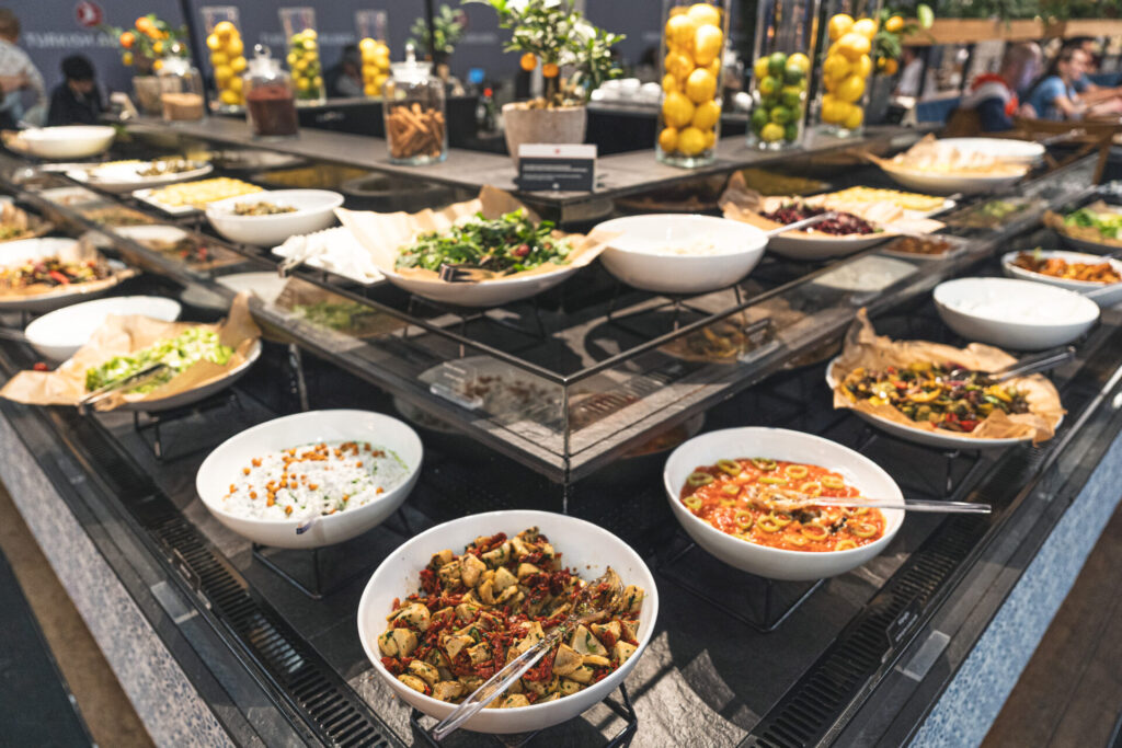 食事の美味しさと種類の豊富さで非常に評判の高いこのラウンジ。トルコの前菜「メゼ」コーナーには、オリーブだけでも数種類、そしてフムスにサラダに…とトルコの伝統的な前菜がずらりと並びます。