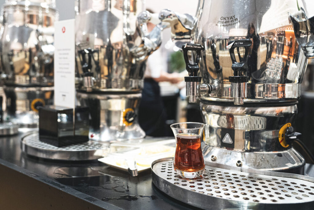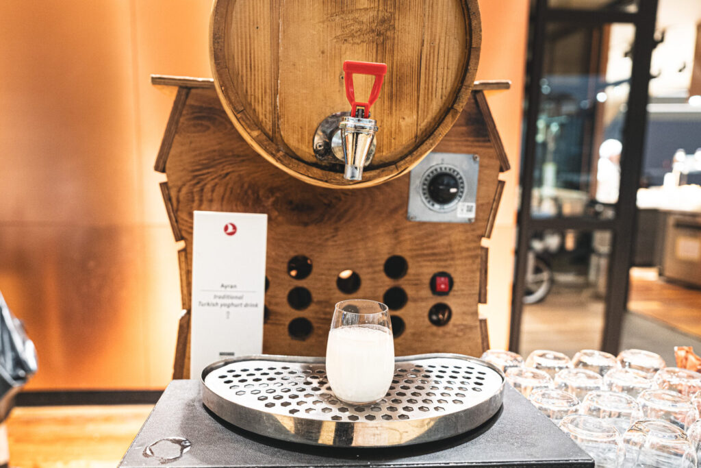 樽に入ったトルコの塩味のヨーグルトドリンク「アイラン」に、レンズ豆のスープ、トルココーヒーにチャイなど…ラウンジ内だけでトルコ料理が一通り楽しめる充実っぷり。