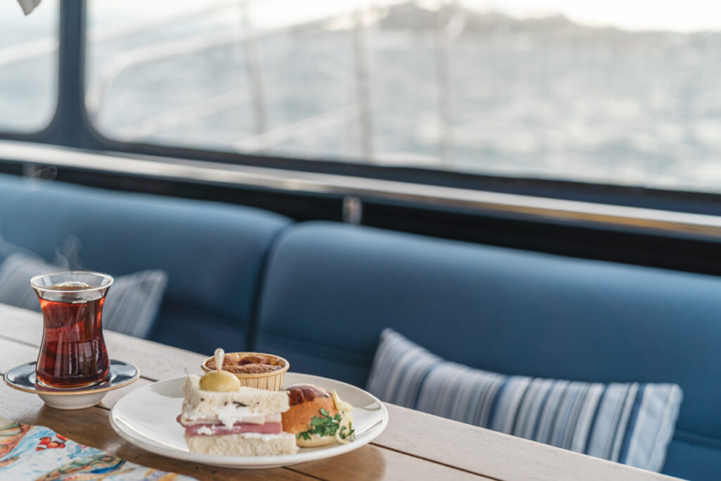 旧市街エミノニュから船に乗り込むと、軽食やドリンクの用意が。
