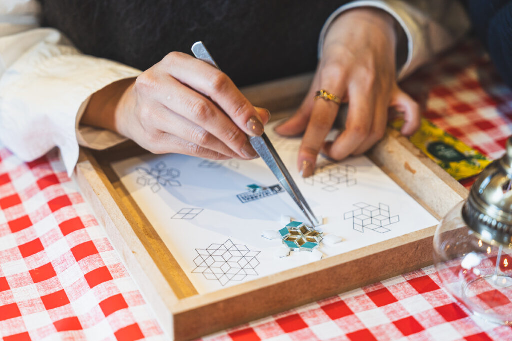 ランプのガラス部分に、色鮮やかなガラスピースを伝統的なモザイクデザインで一つひとつ貼り重ねていく、モザイクランプ作り。