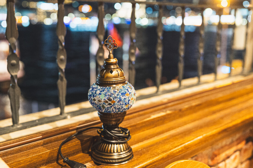水面に反射するイスタンブールの夜景を眺めながら、トルコ料理をモダンにアレンジした独創的なタパス(小皿料理)を楽しめます。