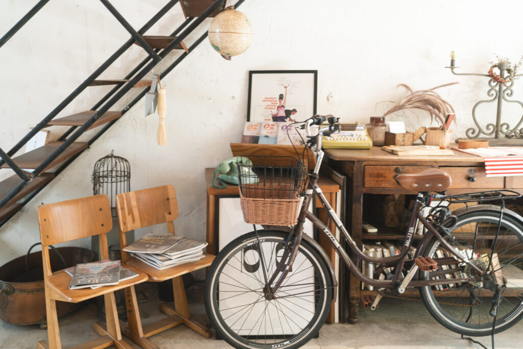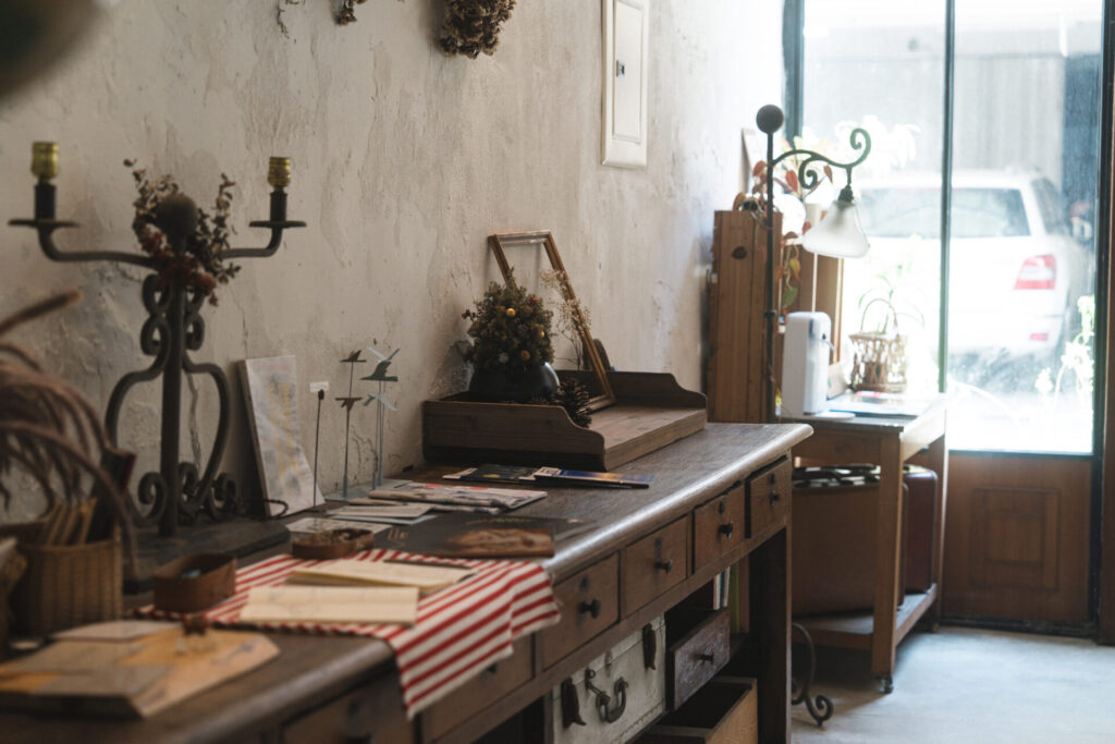 宿の共有部分も、アンティークムード漂う家具や古道具が配置されていてとても可愛らしい内装に。