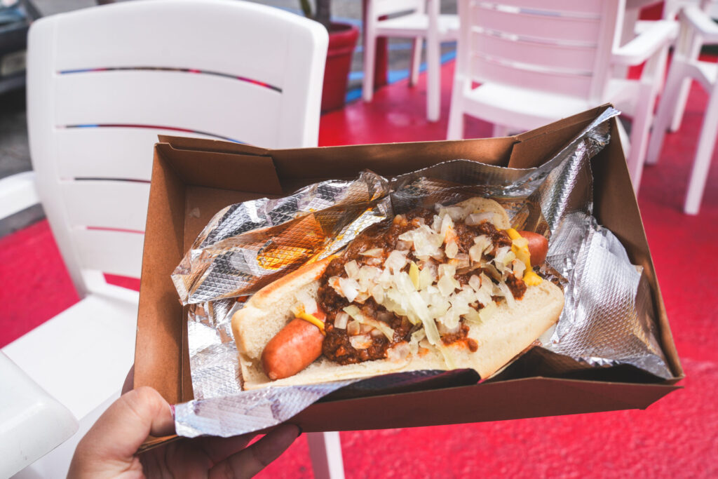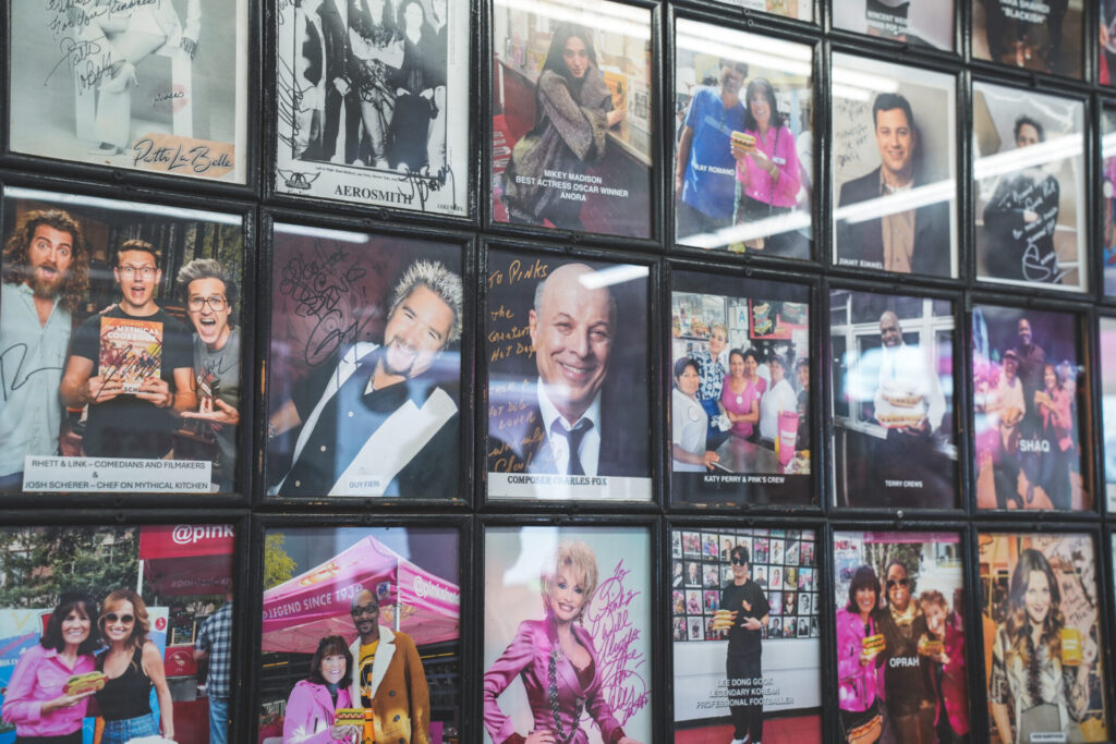 「Pink’s Hot Dogs」は1939年創業で、ハリウッドスターにも大人気のフォトジェニックなホットドッグ店です。看板からド派手なピンクで、テラス席や周辺の壁もフォトスポット満載。