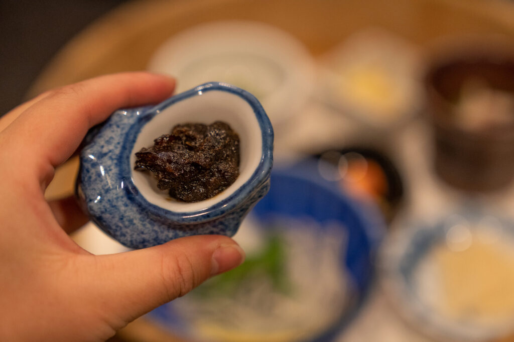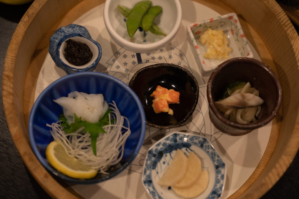 次に運ばれてきたのは、膳先小鉢7品。海の町らしい小さなおかずが並んで、食欲のスイッチが入ります。なかでも印象に残ったのが、次の2品でした。(季節によって内容が変わります)