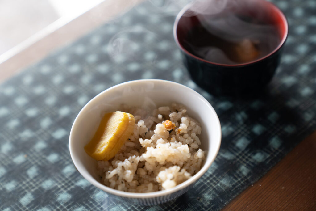 炭火で焼いたお餅が入ったお味噌汁。お餅は海女さんのおやつでもあるそうで、炭の香りがほんのり移ったやさしい味にほっとします。