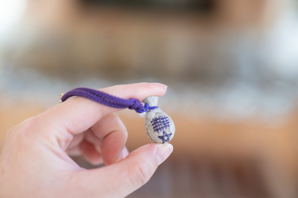 私が手に取ったのは、石を麻布で包み、本真珠を添えたお守り。文字や印はすべて手書きとのことでした。