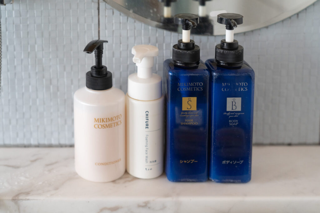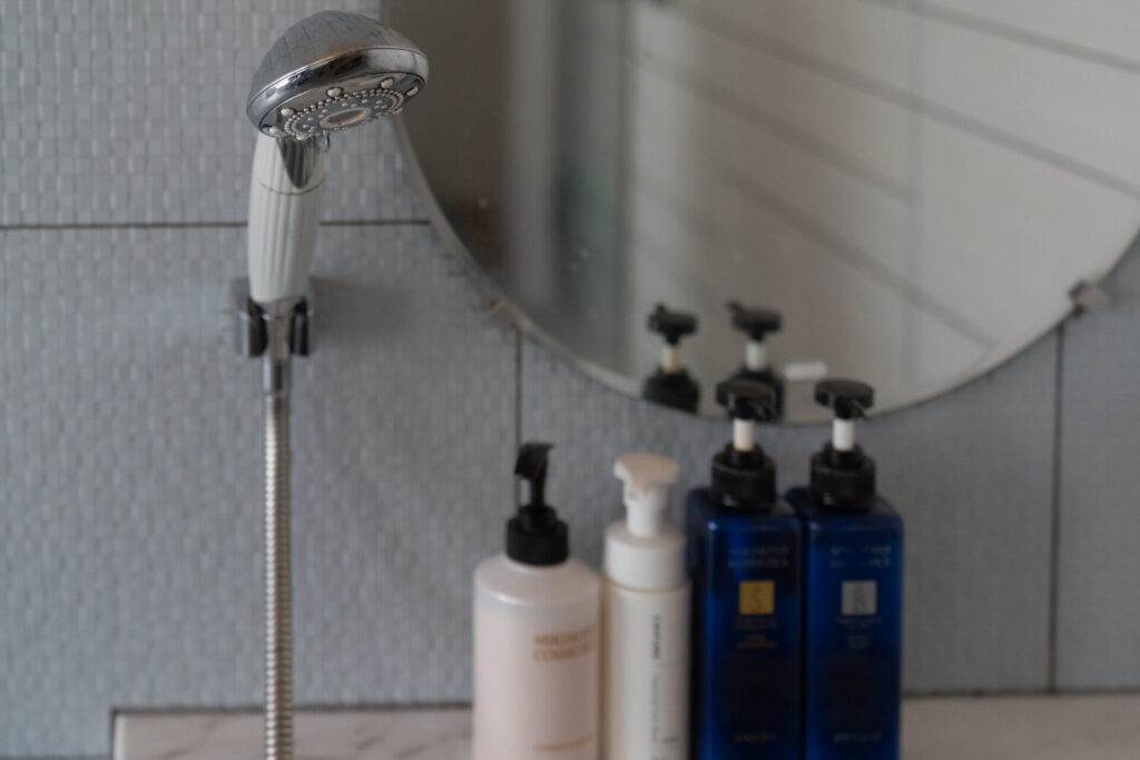 貸切ひとり湯だけの特別感も。シャワーヘッドはRefa、そしてシャンプー類はMIKIMOTOです。