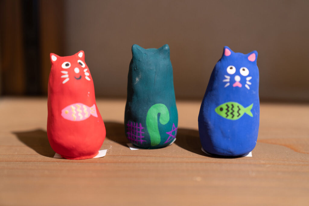 セーマン・ドーマンの印が背中に入ったネコのおきもの。くるっとした表情がなんとも愛らしく、カラフルな色合いにも元気をもらえそうで、私は緑色のネコをお迎えしました。