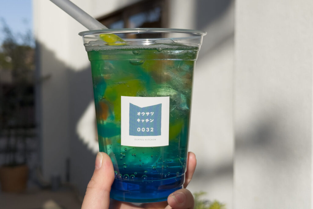 ドリンクは人気No.1の「レインボーところてんサイダー」を。カラフルで写真映えするのに、飲んでみると意外とすっきり。ところてんがちゅるちゃると口の中に入っていきます。