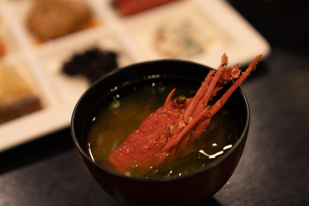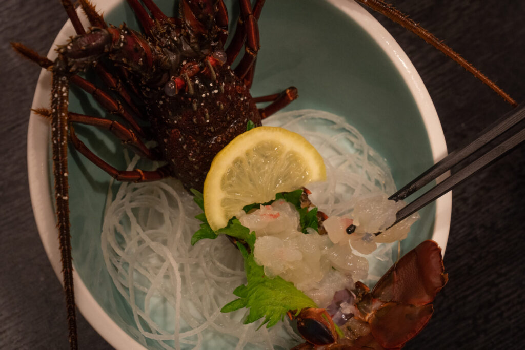 まずは、伊勢海老のお造り。口に入れた瞬間はこりっと心地よく、そこからはするするっとほどけるように溶けていきます。噛むほどに甘みがじわっと広がって、いちばんストレートに素材の強さが伝わる食べ方でした。