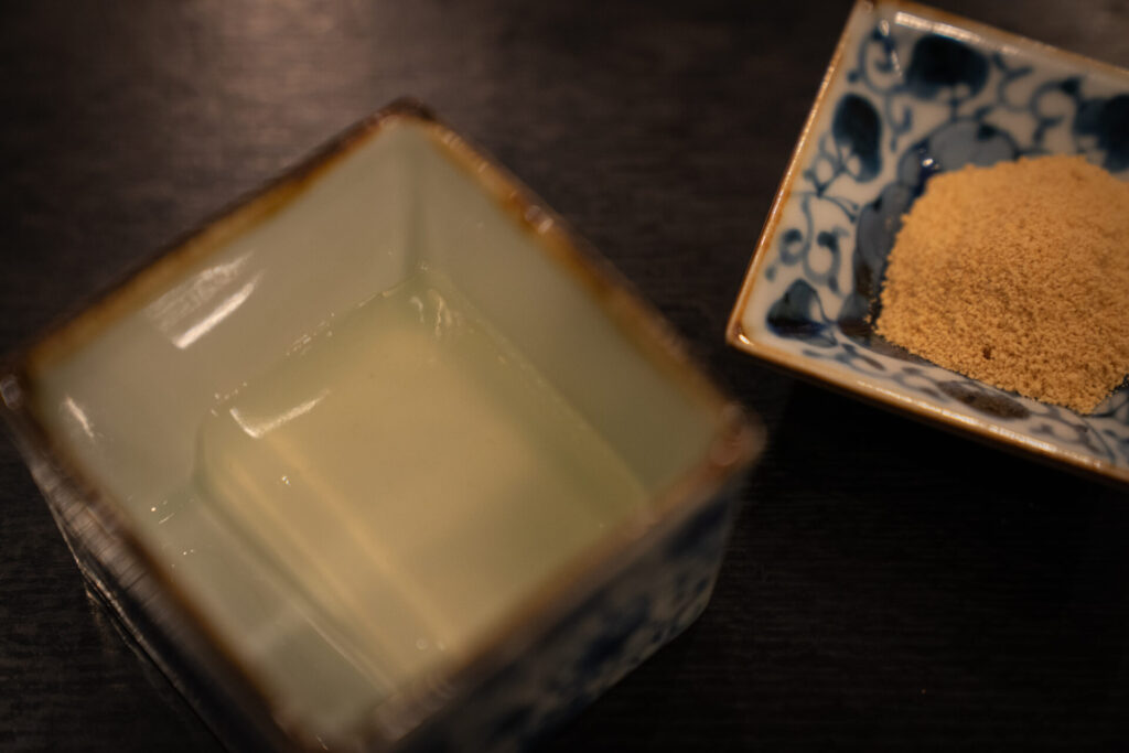 セットの締めは、ところてん。すっと喉をすべってほどけていき、そこに濃厚なきなこがふわり。