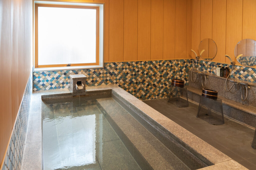 タイル使いがおしゃれな男女別の大浴場。こぢんまりしていて落ち着くタイプでした。