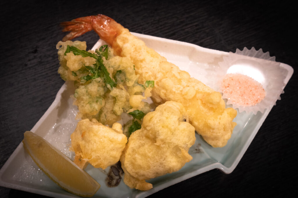 揚げ物は、畑で採れた野菜が主役。春菊と里芋は畑で採れたもので、里芋は一度炊いてから揚げるという手のかけ方。牡蠣とエビの天ぷらは、ピンクの岩塩でいただきます。