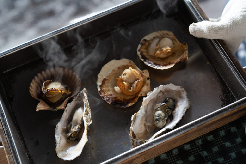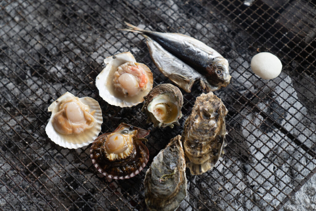 サザエをはじめ、相差で獲れた旬の海の幸をいただけます。かまどの前に座ると、パチパチと弾ける炭の音。海の幸が網にのせられ、ふわっと立ちのぼる煙。潮の香りが、ふわりと鼻をくすぐります。
