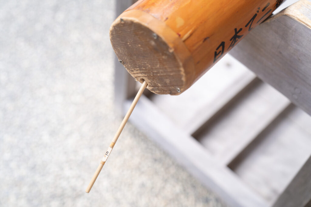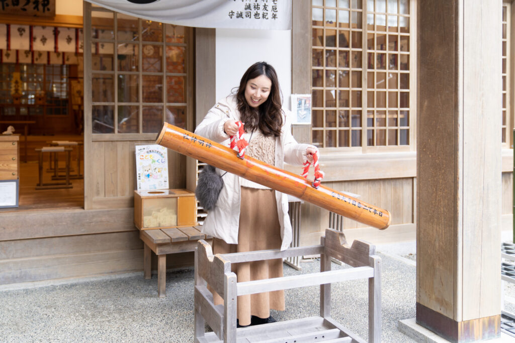 参拝を終えたら、本殿の目の前で存在感を放っている名物の巨大おみくじを。