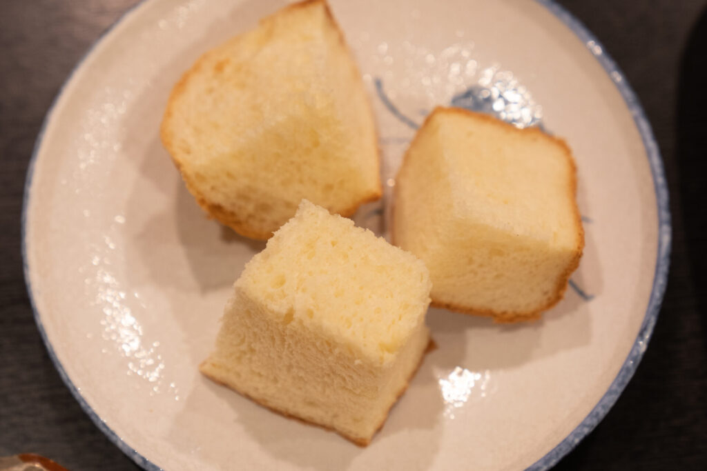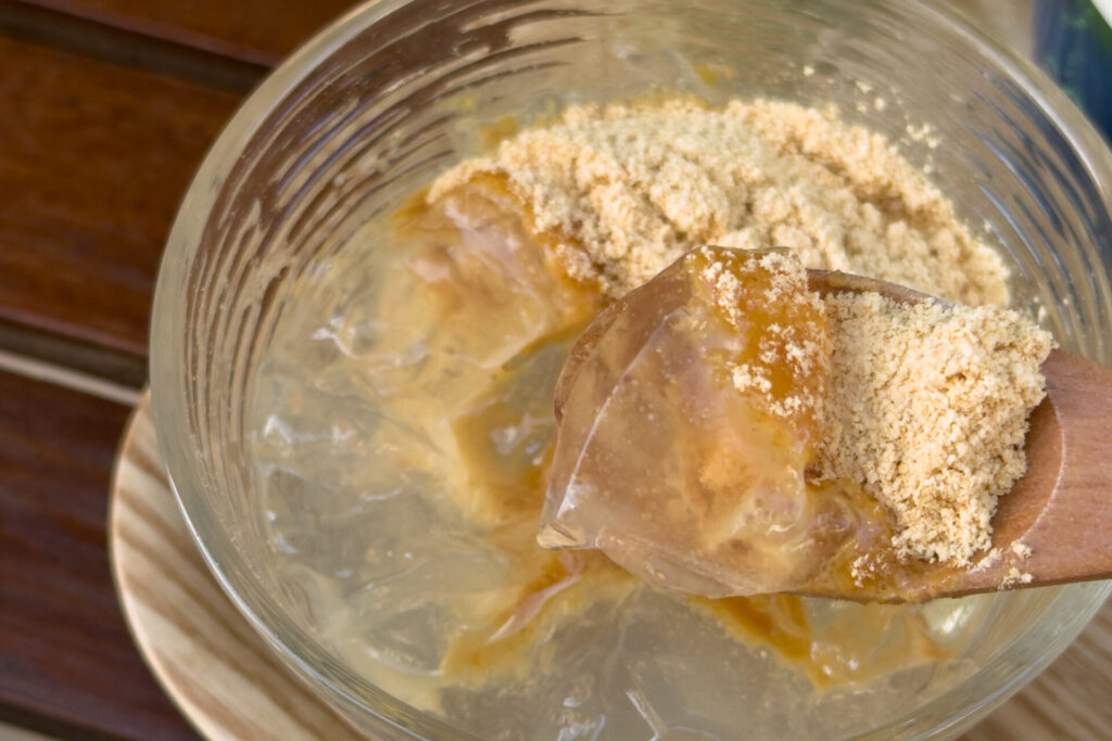 デザートには「ところてん」。じゅんこさんが採ってきたテングサを、じゅんこさん本人が仕込んで作るという贅沢な一皿です。食べるときはきな粉をかけて、わらび餅みたいに楽しむスタイル。
