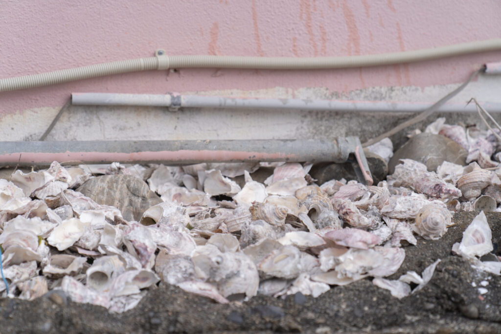 神明神社までのなにげない参道を歩く時間も旅の醍醐味。ぷらりと歩いていると、路地の端に貝殻がずらりと敷き詰められている場所がいくつもありました。