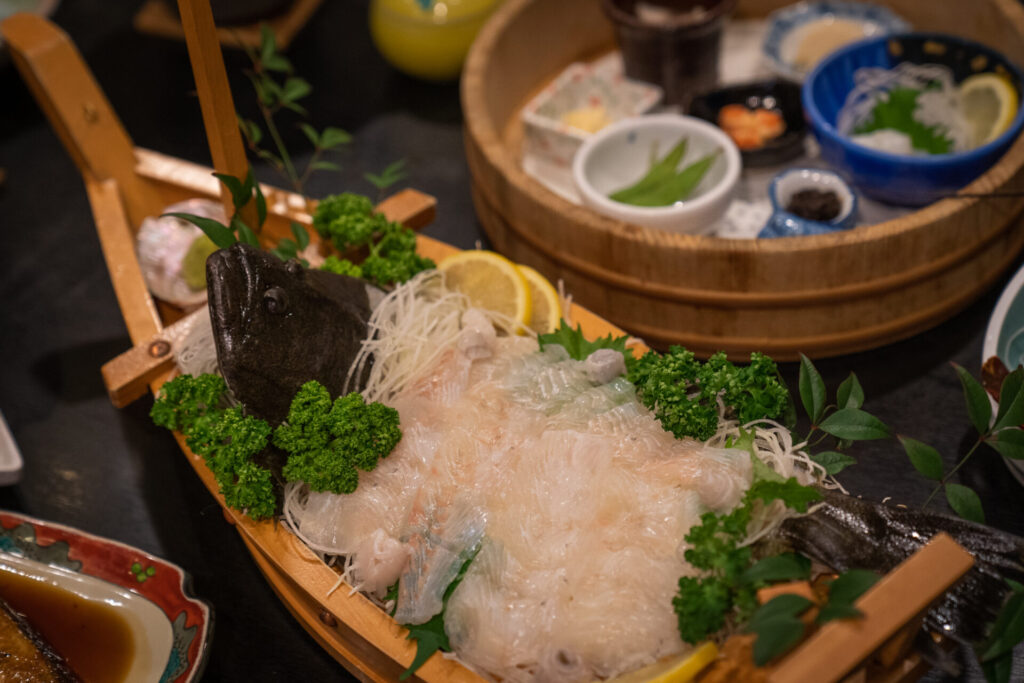 2人前から楽しめる船盛り。これだけでテーブルが一気に華やぎます。この日はヒラメで、身は弾力があってぷりぷり。噛むほどに甘みが広がりました。