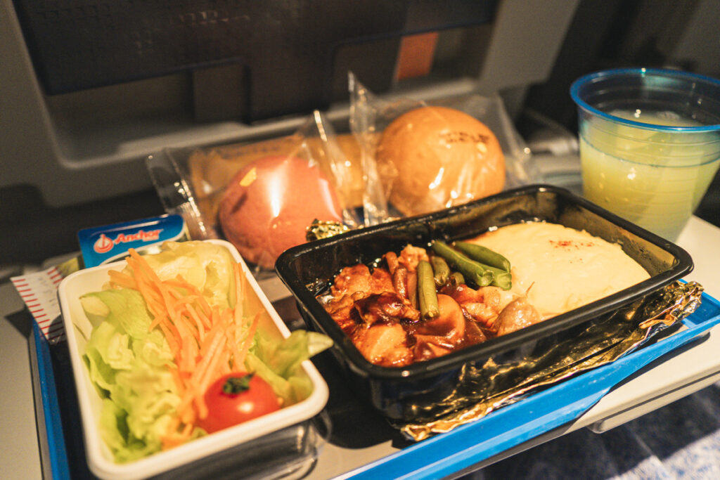 機内食は、チキンとビーフ、パスタから選べ、私はチキンをチョイスしました。