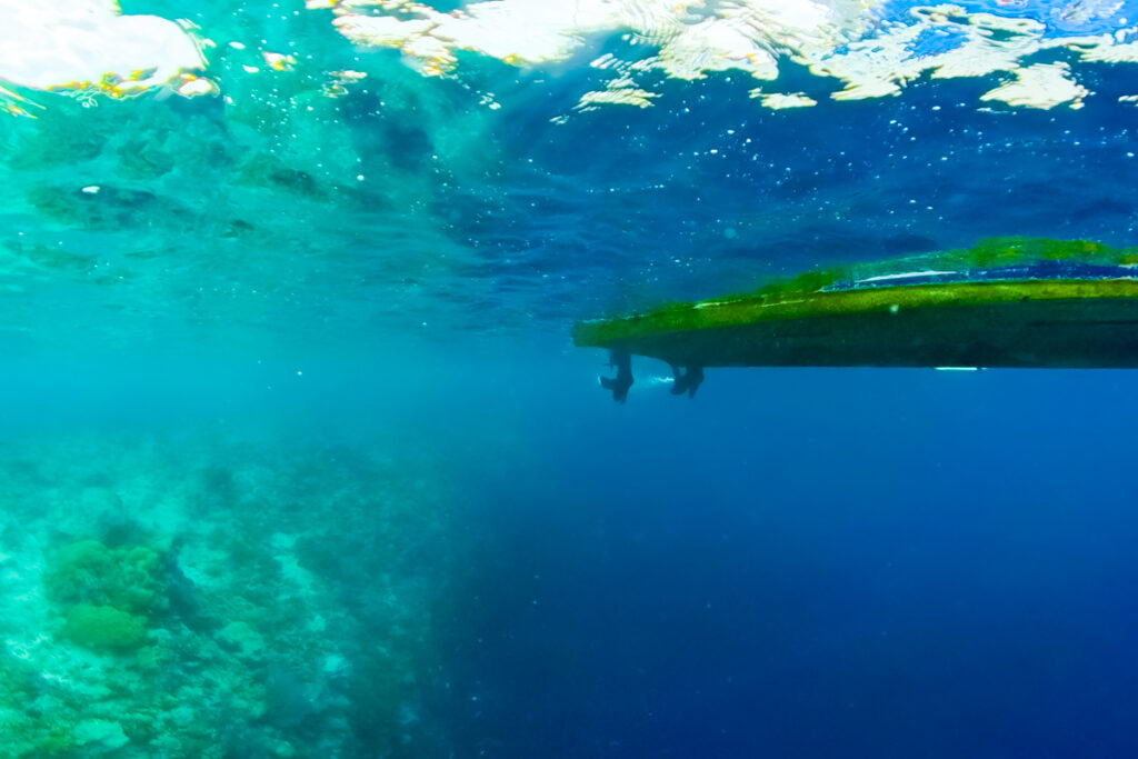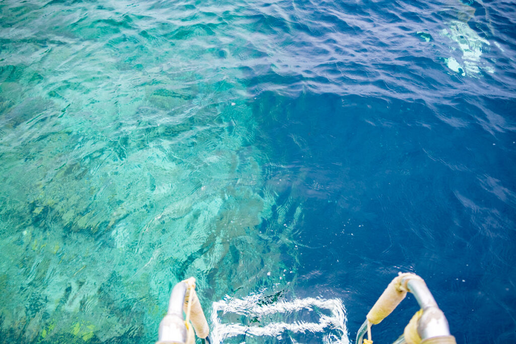 光が差し込む浅瀬のすぐ横で、深い深い海の底は吸い込まれそうなほどに濃い青をたたえ、光と影が織りなすドラマチックな景色が広がります。