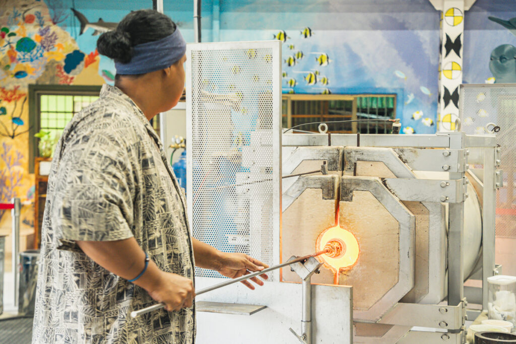 こちらのガラス工芸品は、パラオ国内で出た廃瓶を原料にし、さらに燃料には廃プラスチックを再利用した再生油を使うという、環境に配慮した取り組みから生まれています。