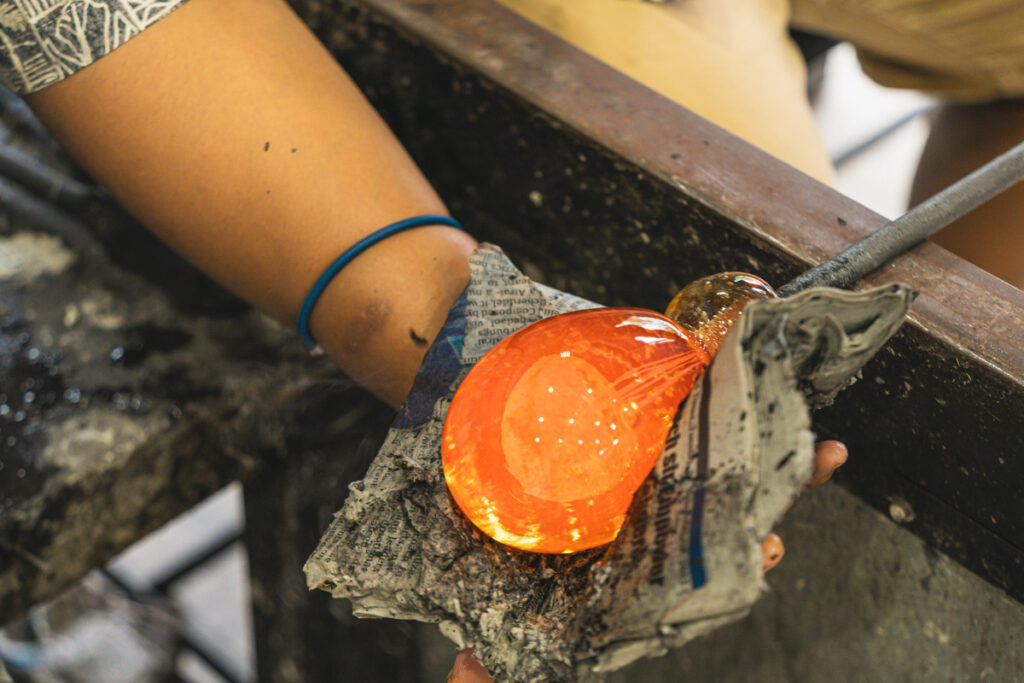 壁一面にポップなアートが描かれた工房で、職人が一つひとつ丁寧に作る様子を見学できるほか、実際に吹きガラスやサンドブラストの体験も可能。併設されたショップで購入することもできます。