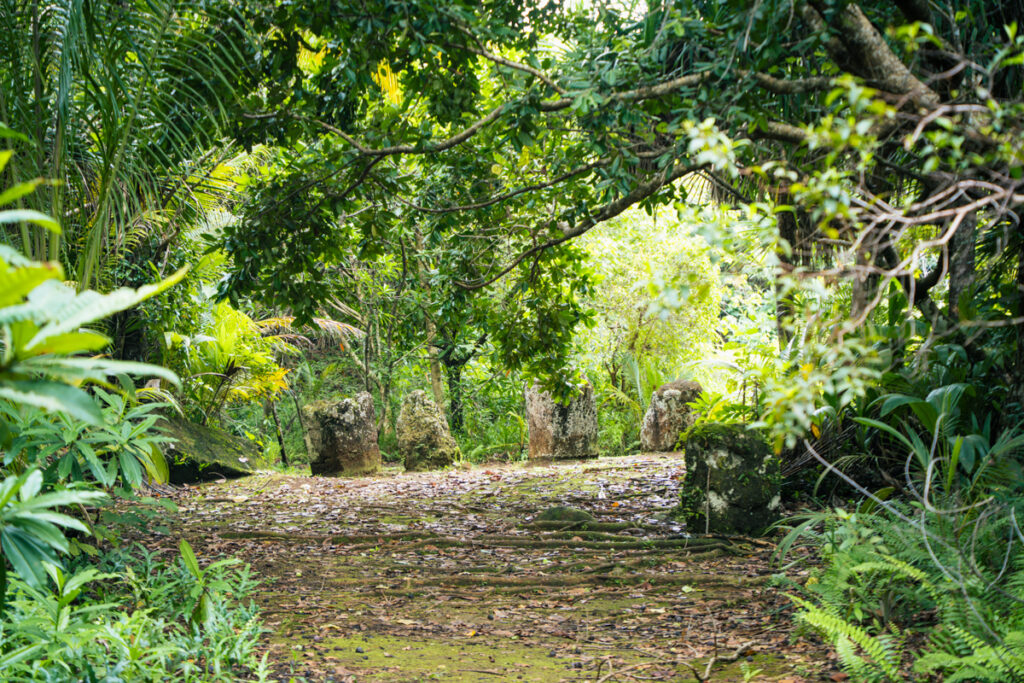 ジャングルの湿った土の香りと緑のトンネルをくぐり抜けながら、坂道や階段をくだっていくと、複数の巨大な石柱が地面に埋まるようにして建ちならぶ遺跡群へ辿り着きます。