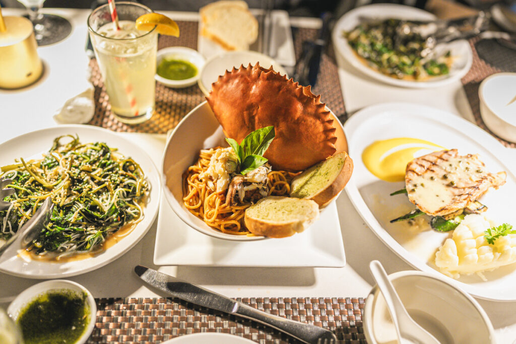 ボリューム満点のマングローブクラブに、ムール貝、テンダーロインステーキ、たっぷりの野菜が並ぶ贅沢なコースです。