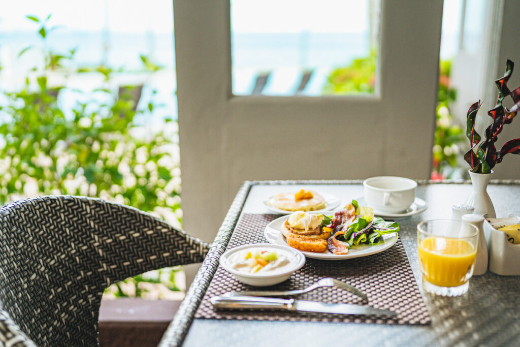 「パラオパシフィックリゾート」の朝食レストランは、プール越しに白いビーチが広がる開放感あふれるロケーション。心地よい潮風を感じながらいただく、まさに理想のリゾートの朝食。